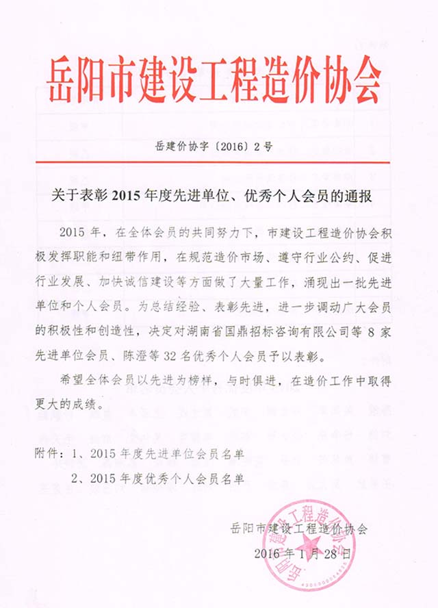 我公司榮獲2015年度岳陽市工程造價協會先進單位榮譽,同時徐俊,倪娟榮獲岳陽市造價協會2015年度優秀個人榮譽。